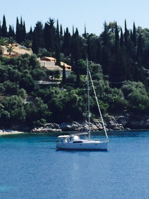 We motored up from Lakka – getting closer to the top of Corfu Island. It was oily calm for most of the way – then the afternoon sea breeze turned into 35 knots – force 8.