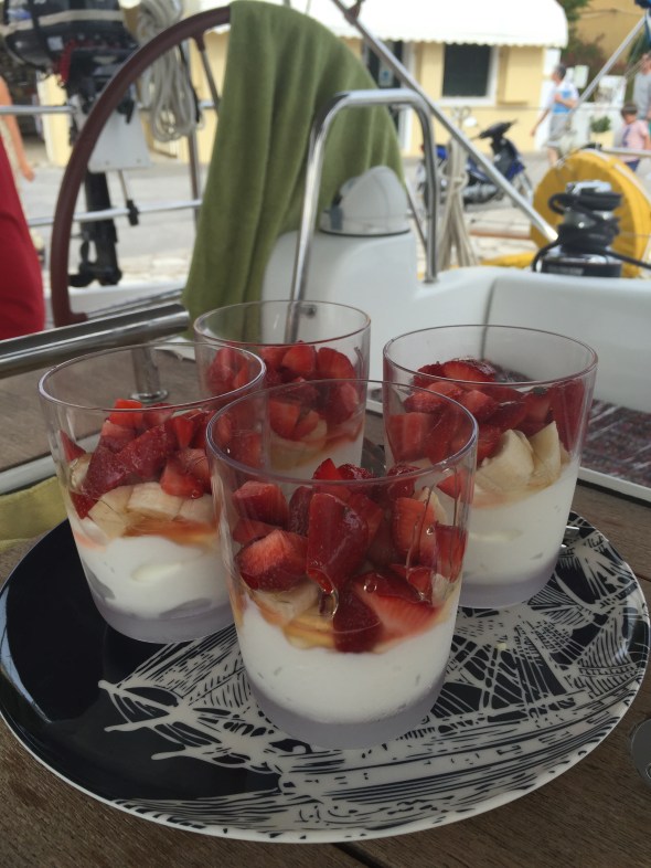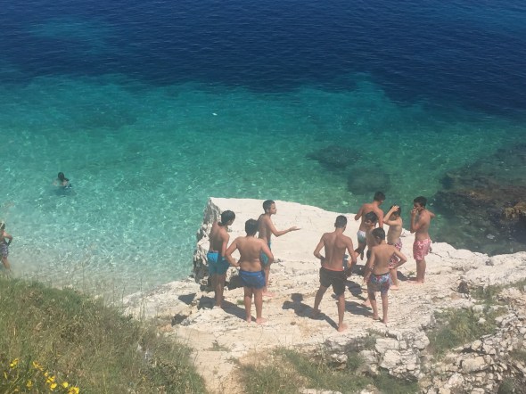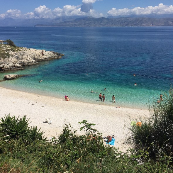 We park the boat in the little harbour and walk around to the beach called Kanoni.