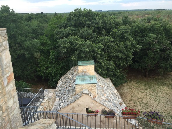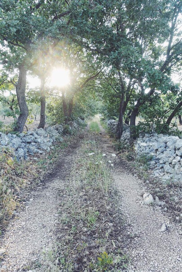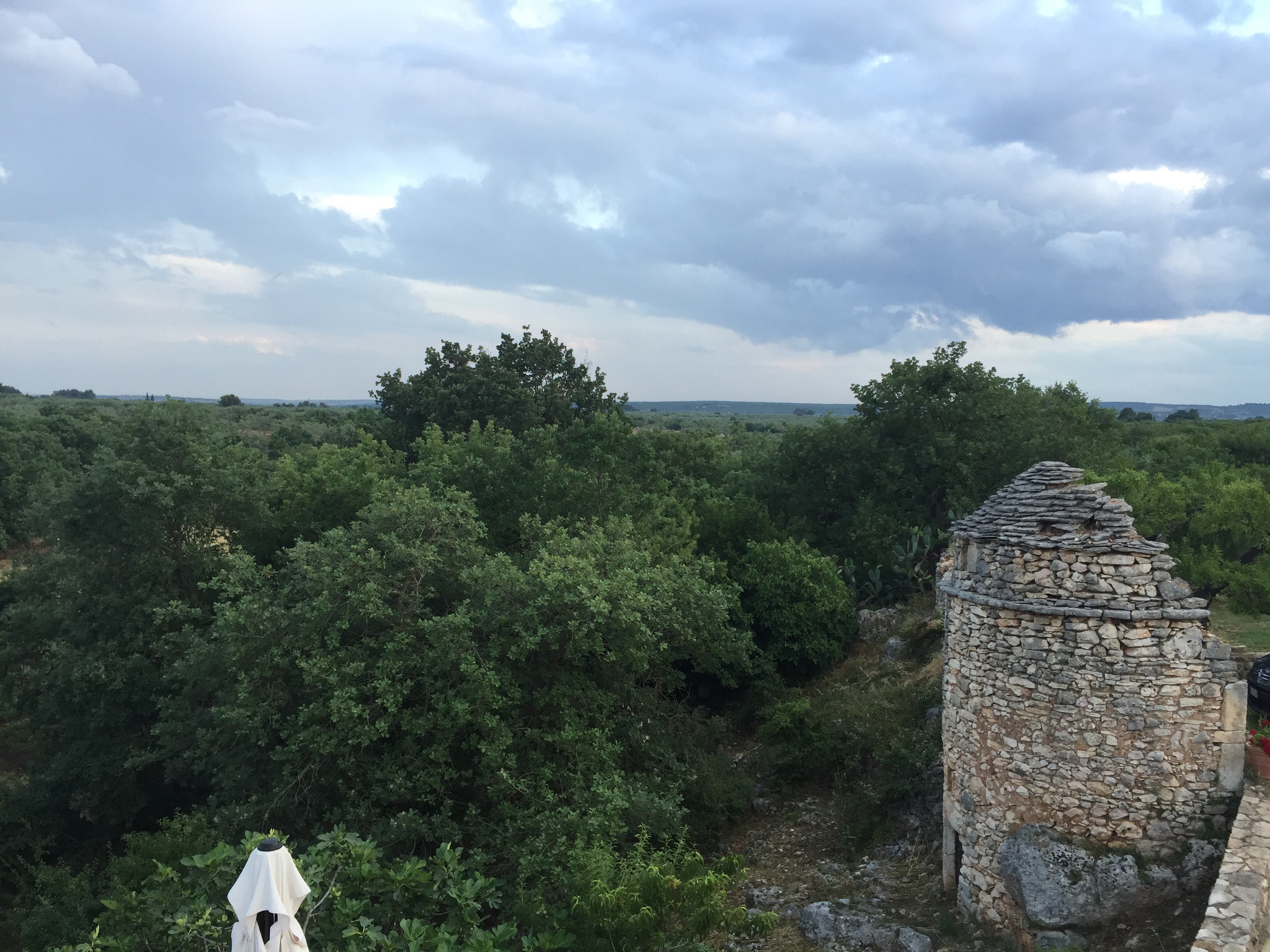 Masseria. Storica Pilapilucci – ghe view out through the olive groves. yhe building brliw is the old oven that is now a suite