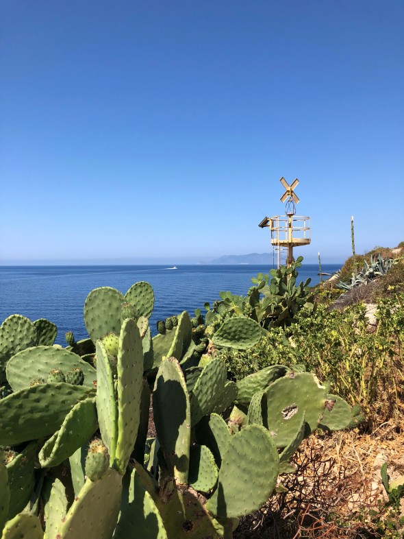 The weather has been perfect for no sailing. Very light breezes. We went across the channel to Levanzo. It’s 4 miles away- clearly visible, much smaller and taller than Favignana. A little settlement pushed into the south face. Such clear water.