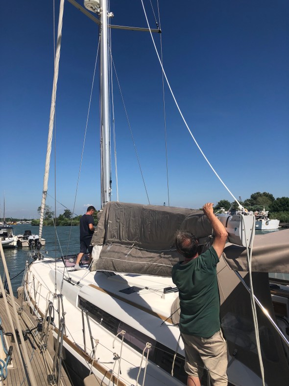 The boys at the Blue Dolphin worked all day to help us get the sails back on, new sheets (ropes) threaded and all is done.
