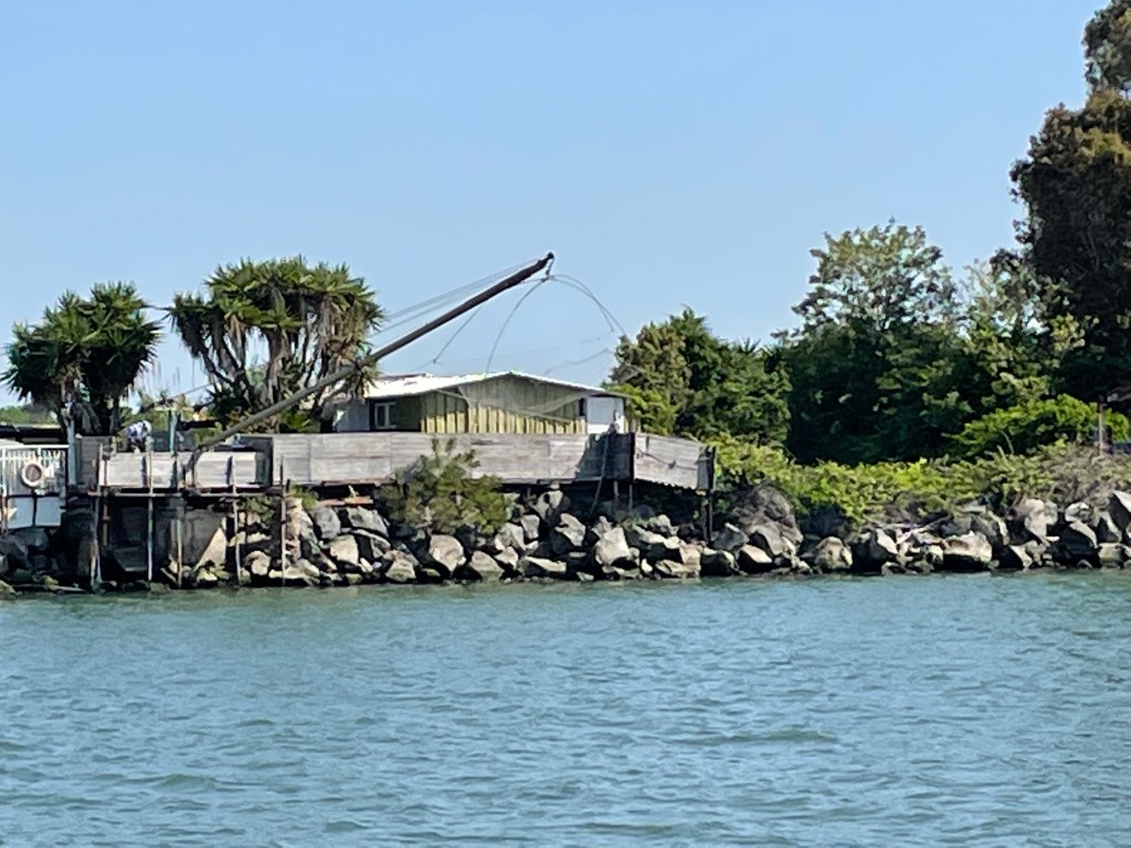 It’s also surprising how ‘low key’ the entrance to the Tiber is. It is still a working port with dockyards either side and the ancient fishing huts with their big pontoons and nets suspended over the water.