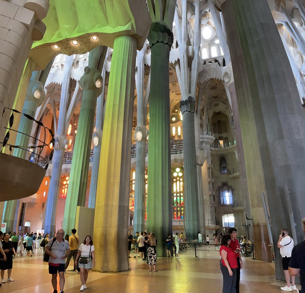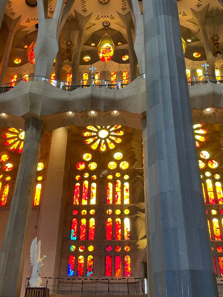 Started in 1886 , the first Architect lasted one year and then Gaudi was commissioned. He would have been in his 20’s and he had worked on the Basilica in Mallorca. His methods of design were based on nature and his methods of making models and testing strength were unique. As you walk into the main space of the church you are walking into a ‘forest’ and the colours of the stained glass reflect the seasons. It is expected to be complete in 2040 with the Glory Facade which is the main entrance finished.