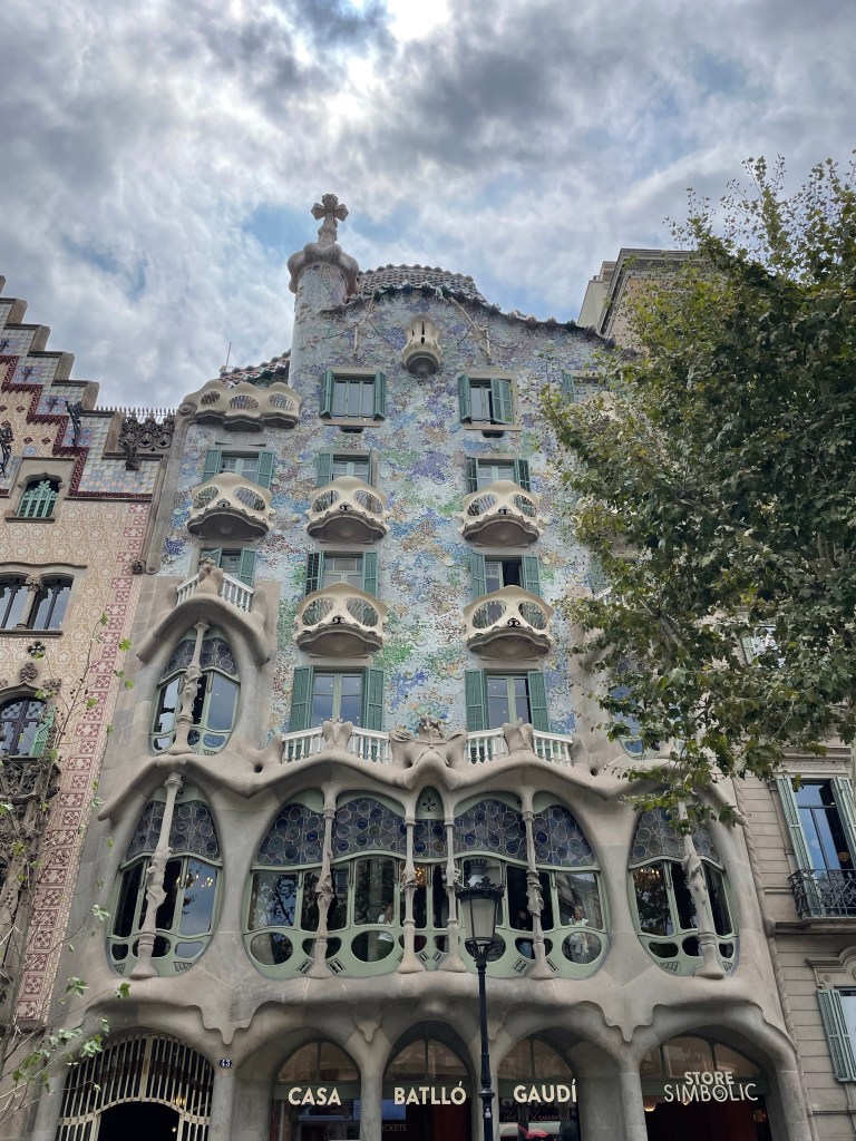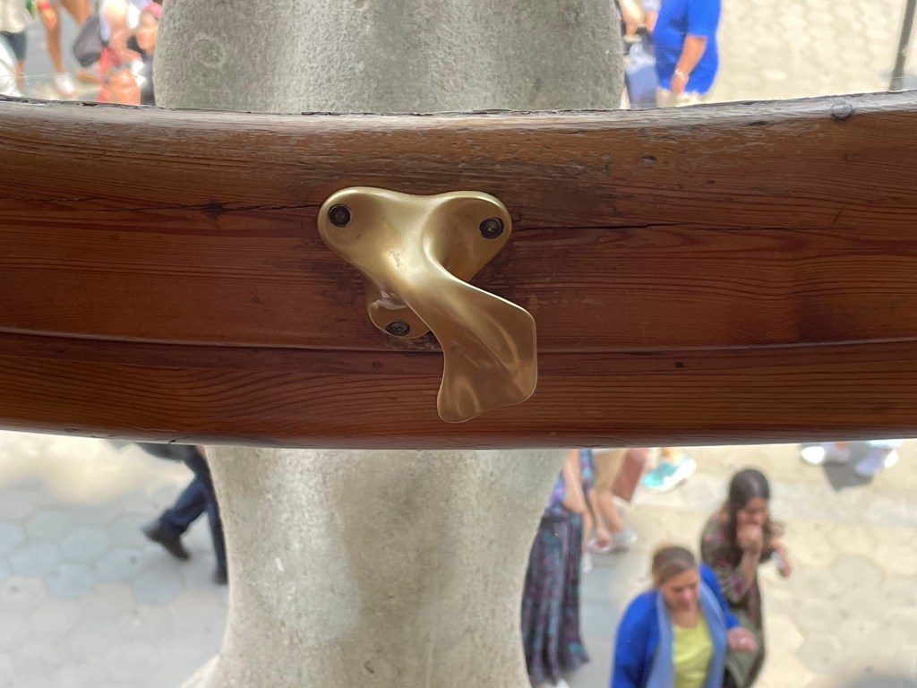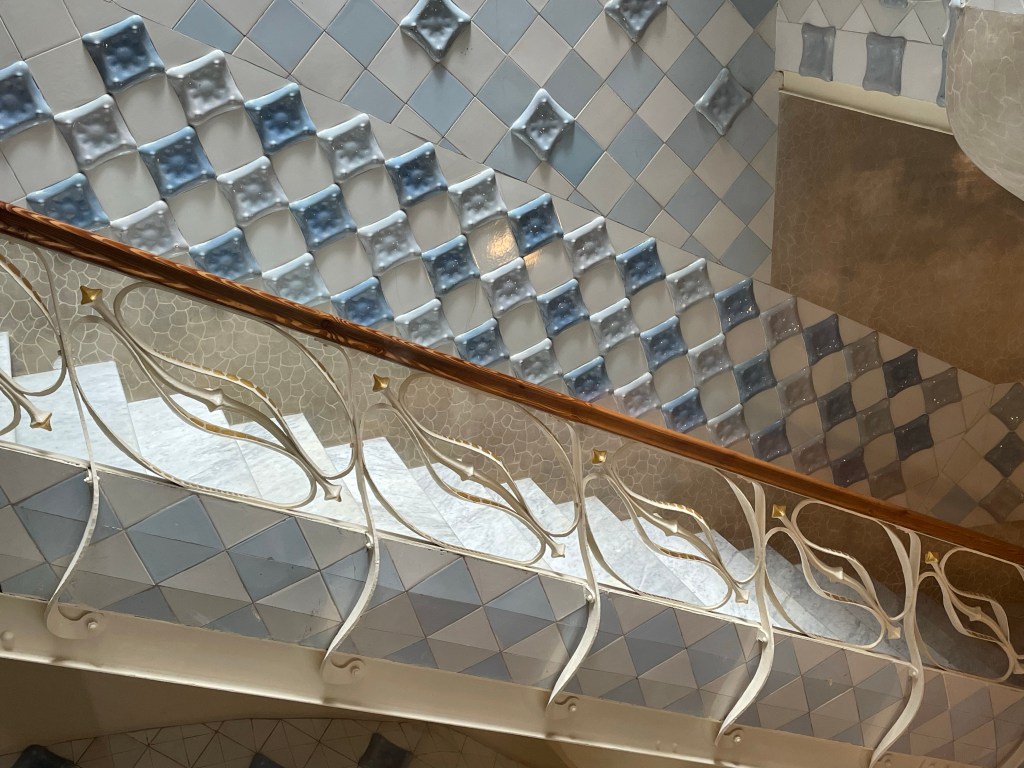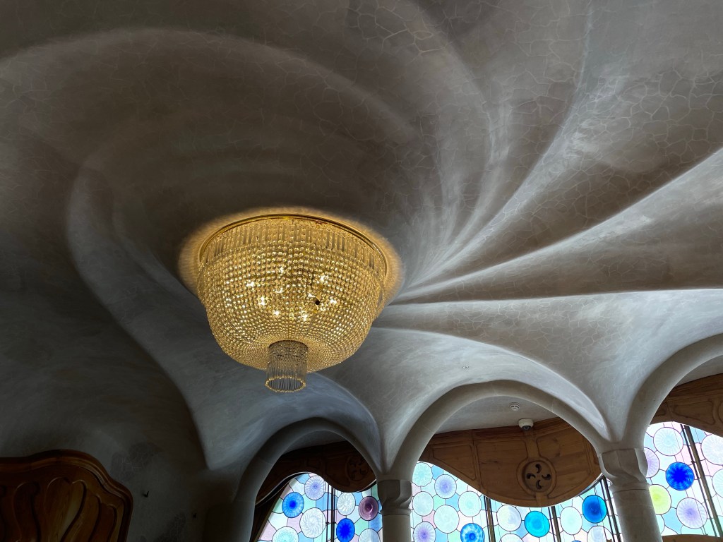 Then onto Casa Batllo. The Batllo’s were a family who wanted an apartment building in central Barcelona. Gaudi talked them into buying an existing building and adding another layer – the Gaudi layer over it. They intended to live there are to let out apartments. The end result is stunning with so many bespoke details. this was 1908 and the last private job Gaudi did before Sagrada Familia.