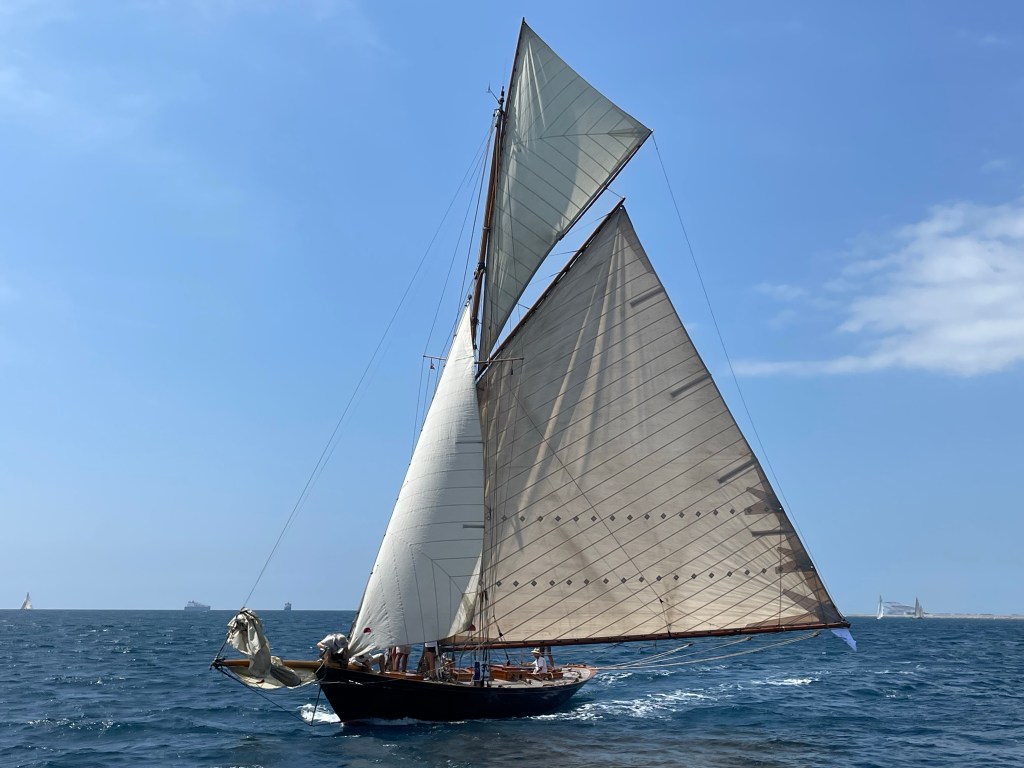 Finally we can go. The work is done , the spares have arrived and Francesco will come out for a test run before we head off proper. As we leave the harbour we are surrounded by the Classic Yachts that are racing today from the Marina. 100 year old timber boats – big and small – and two of the America’s Cup contenders also out for a play. October 2024 Barcelona will host the next America’s Cup.