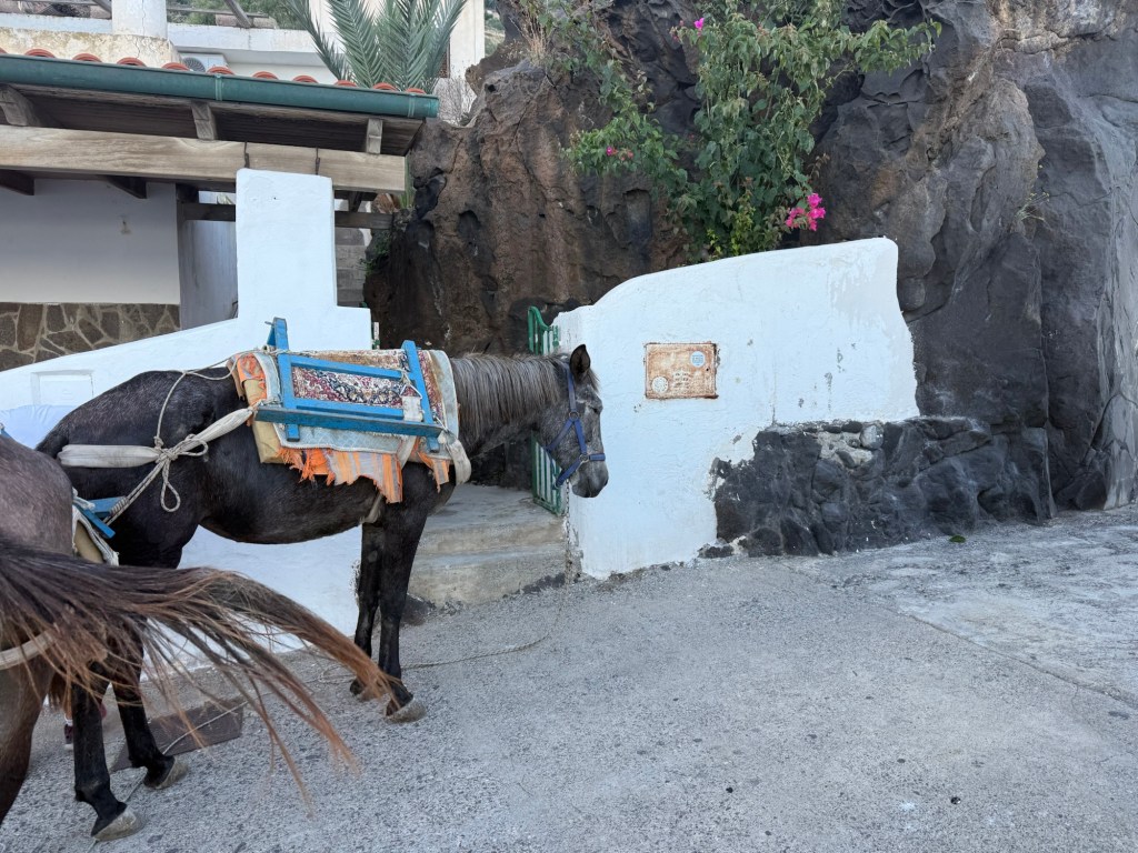 Alicudi is the first of the Islands – about 50nm from Palermo so it takes us the best part of the day to get there. we have booked a “buoy”. There is no anchoring as it is way too deep. 2,000 meters deep just meters from the lands edge. The locals here have a canny way of securing their boats with a long cable that is fixed on land and a motor to haul the boat up out of the water onto the rocks. Donkeys here to take your luggage or whatever but people walk. It is 675m high and houses are up at the very top. It is tiny, unusual with the volcanic rock that looks molten.
