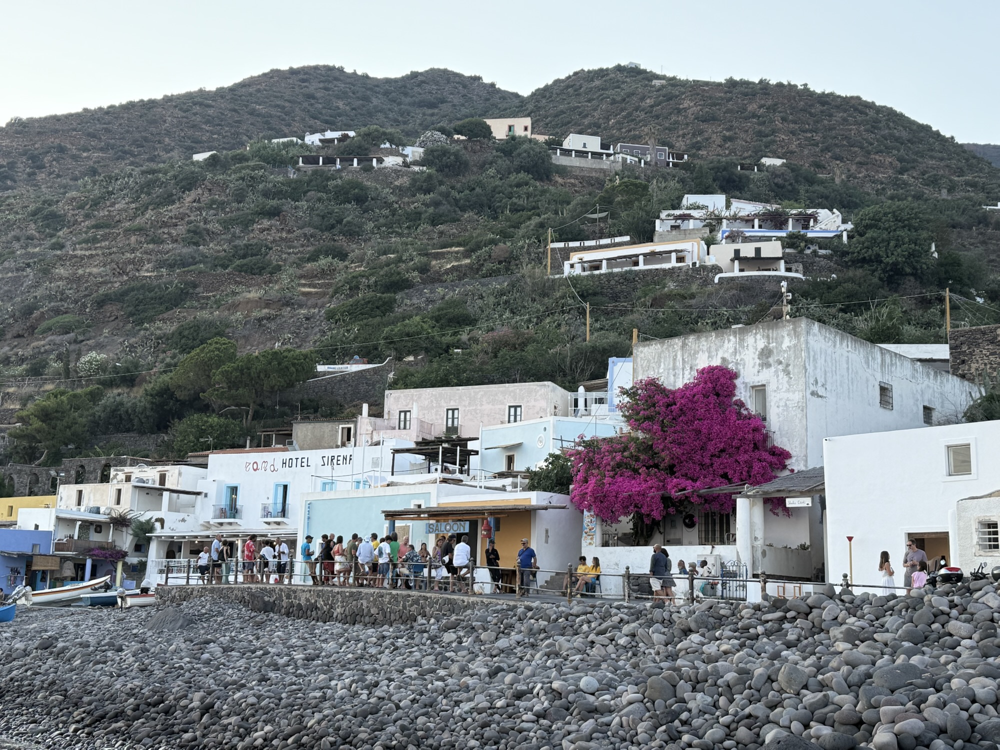 Now onto Panarea which is the most glamorous of all the islands. White, white, white and bougainvillea – it’s so pretty. It’s expensive and tries to be exclusive – we are on a buoy again and here the Marinello runs a 24/7 boat taxi service that comes with the buoy booking. It means you can get dressed up for dinner, wear proper shoes – rather than potentially getting a wet bottom in the dinghy and having to jump in the water at the beach. I prefer the water taxi.