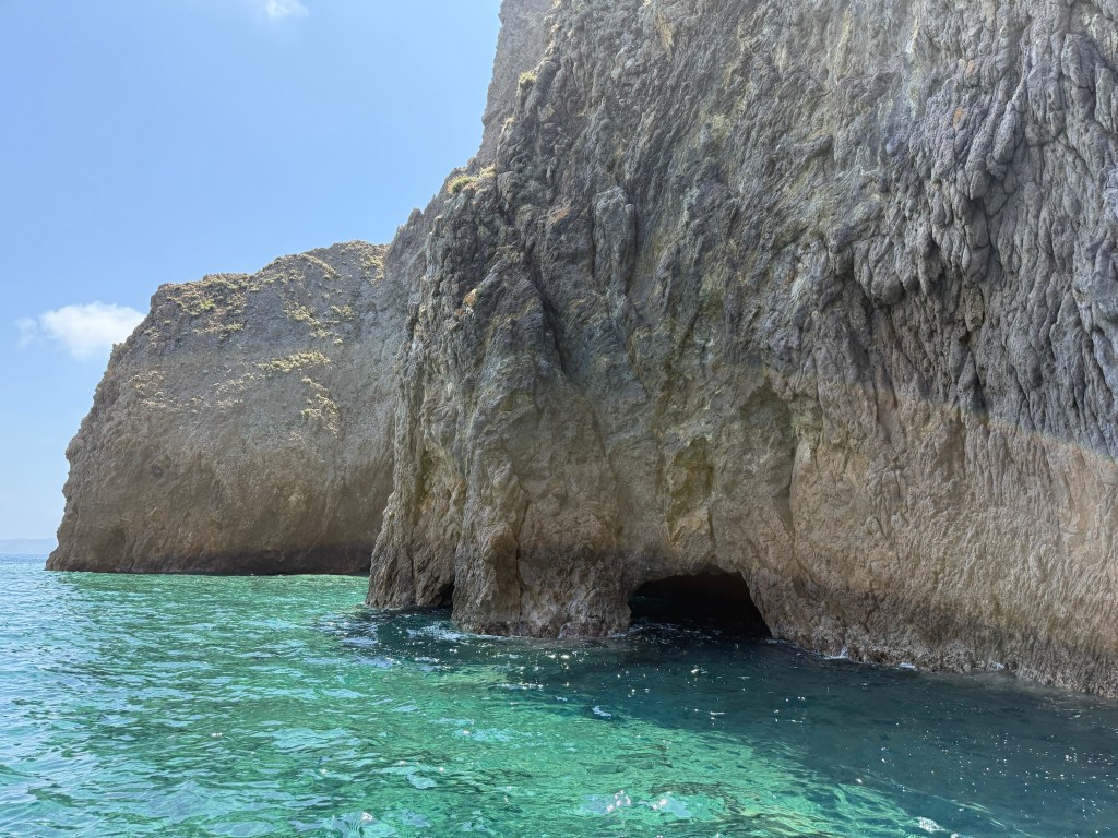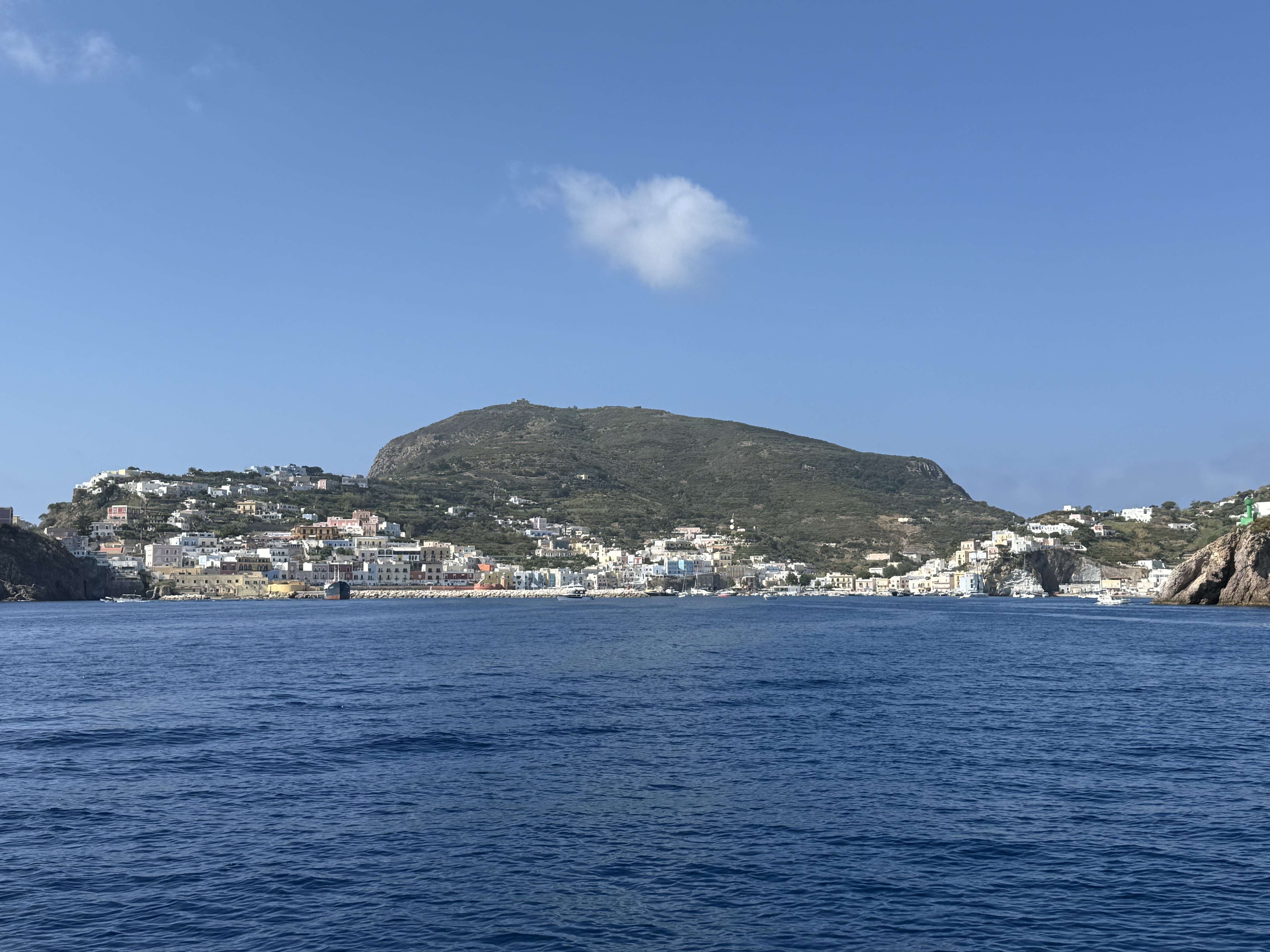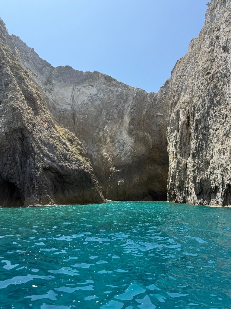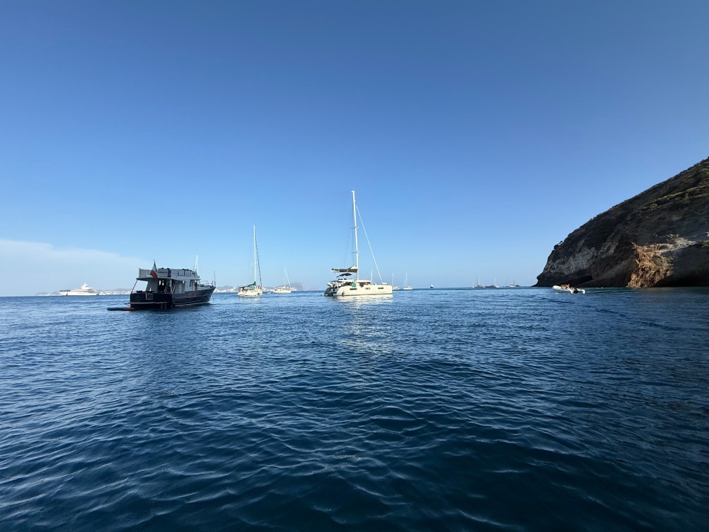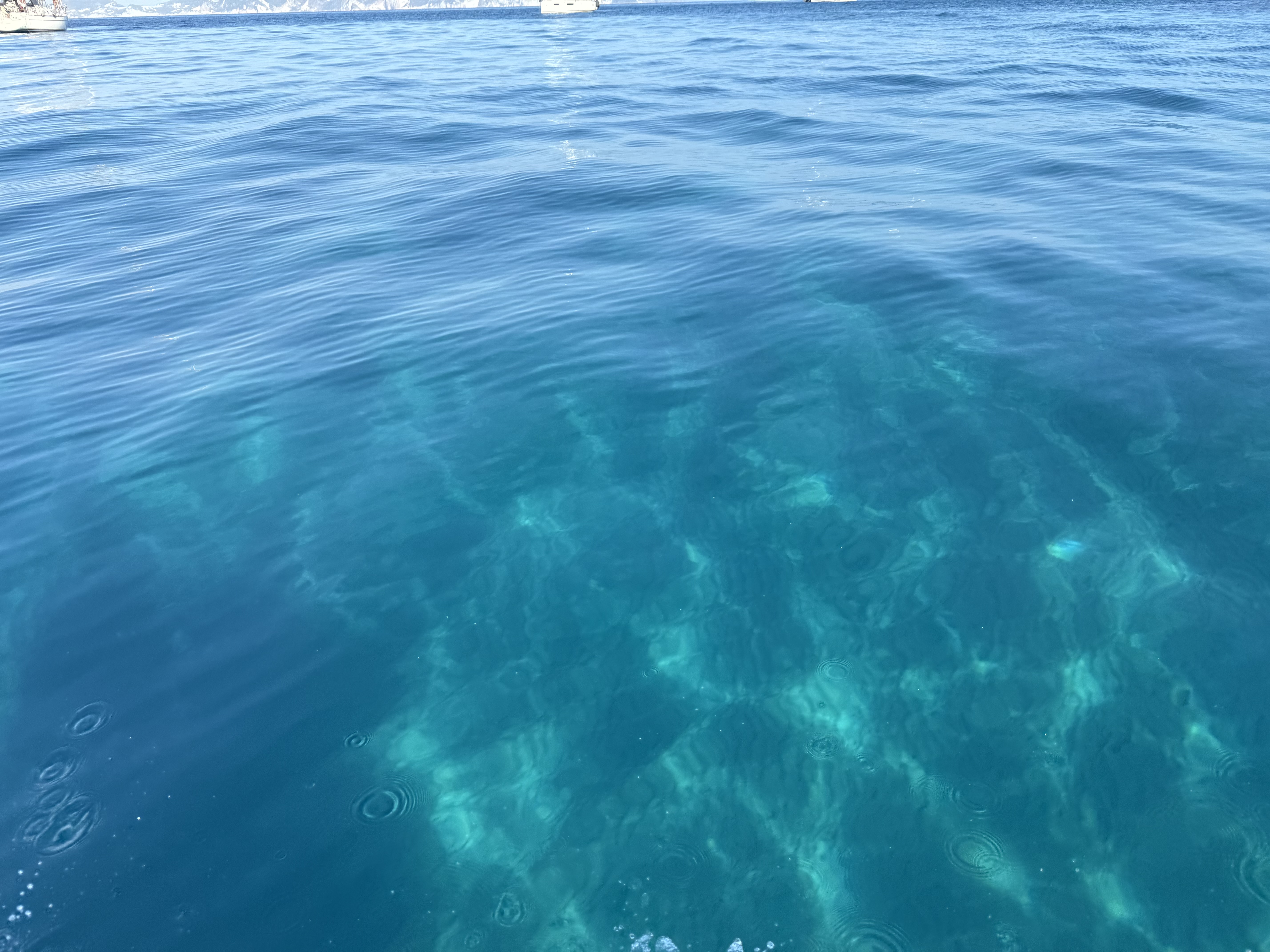 Ponza and Palmarola are busy with boats on the water and people on land. The summer holidays are kicking in and most of the voices we hear are English. Italy has a couple more weeks until the start of August when things really get crazy. For boaters it is possible to come from the Italian coastline very easily and ferries come continually from the mainland. Lots of beaches to choose from and a village filled with cafès and restaurants. Palmarola is a little more removed – you need a boat to get here or come by ferry boat for the day. But the weather is great and letting us anchor in along the incredible edge. Limestone cliffs so this means the water is a clear acqua green. And quite shallow – only 4 meters which is easy.