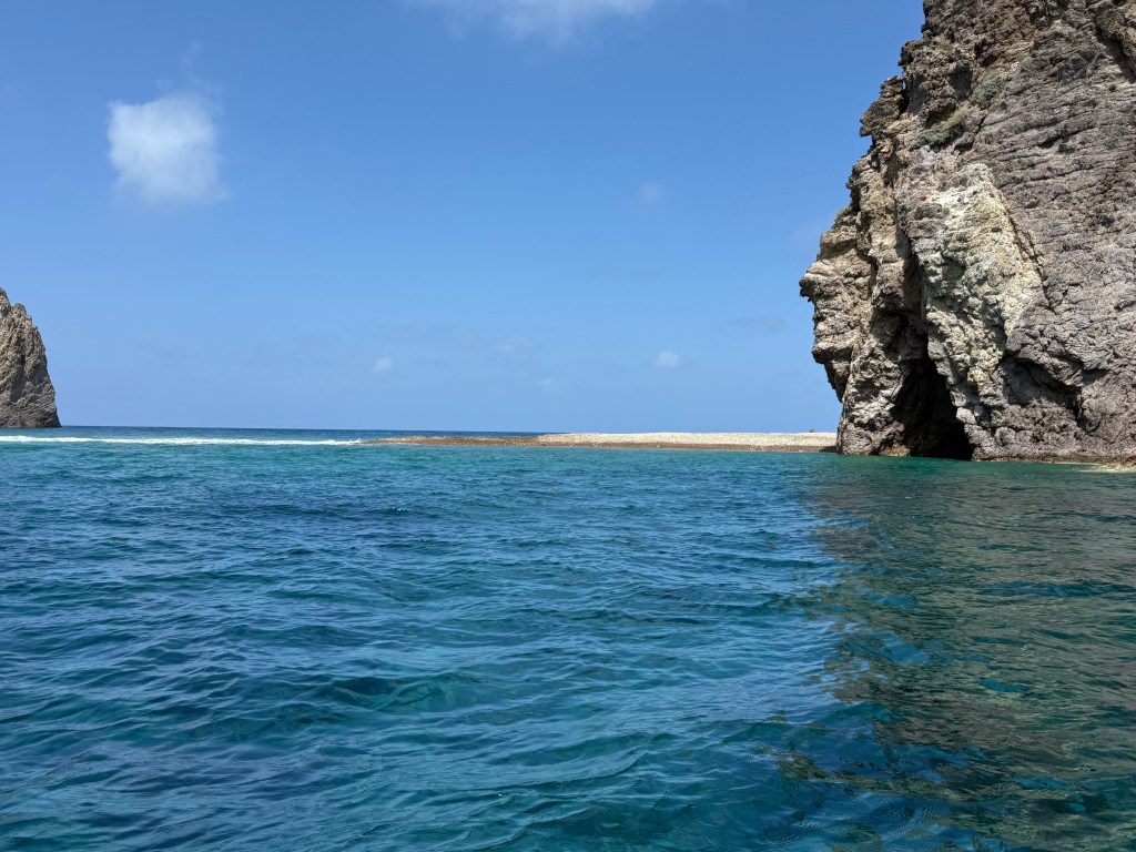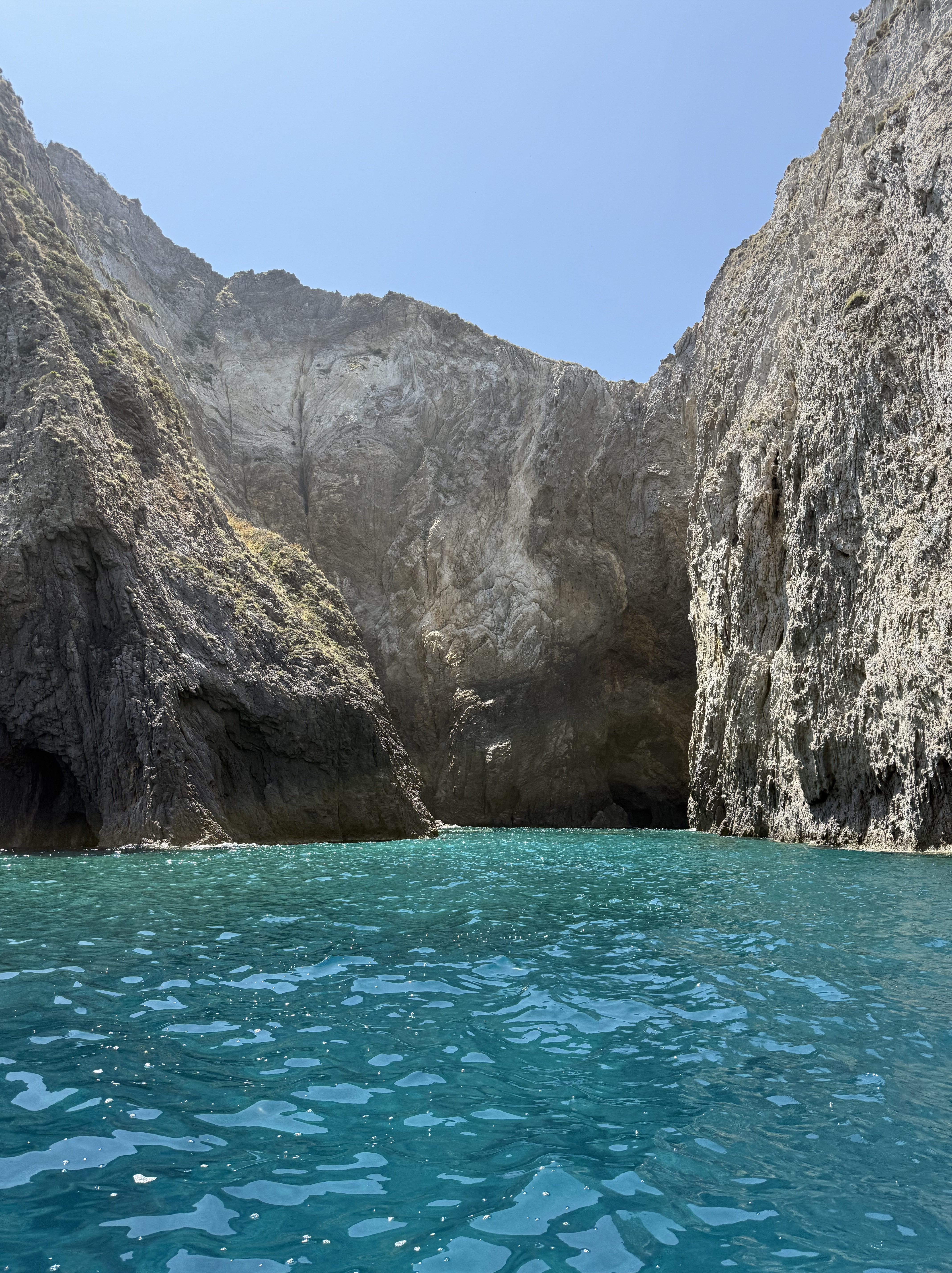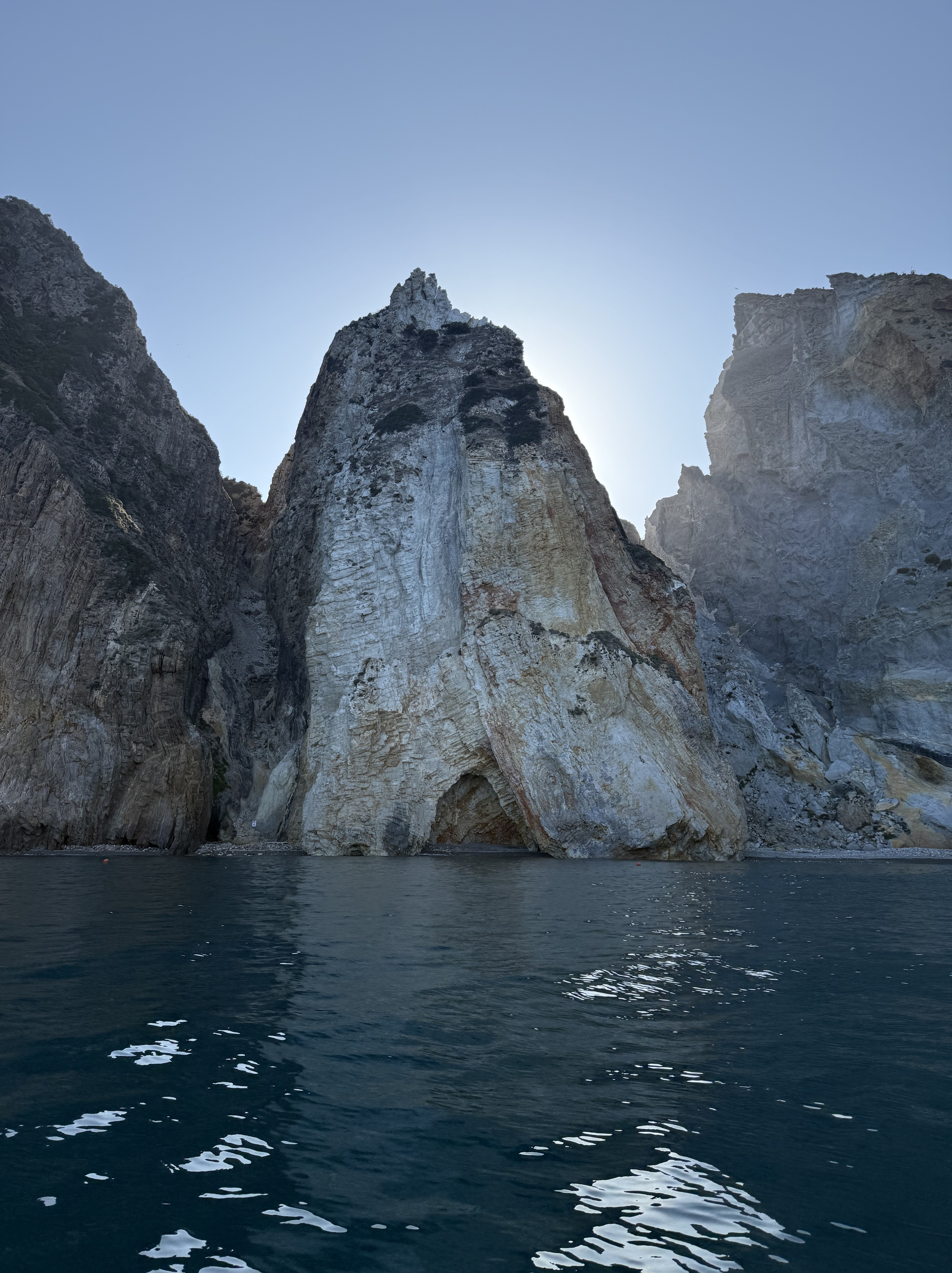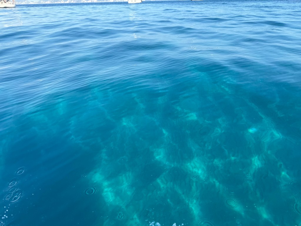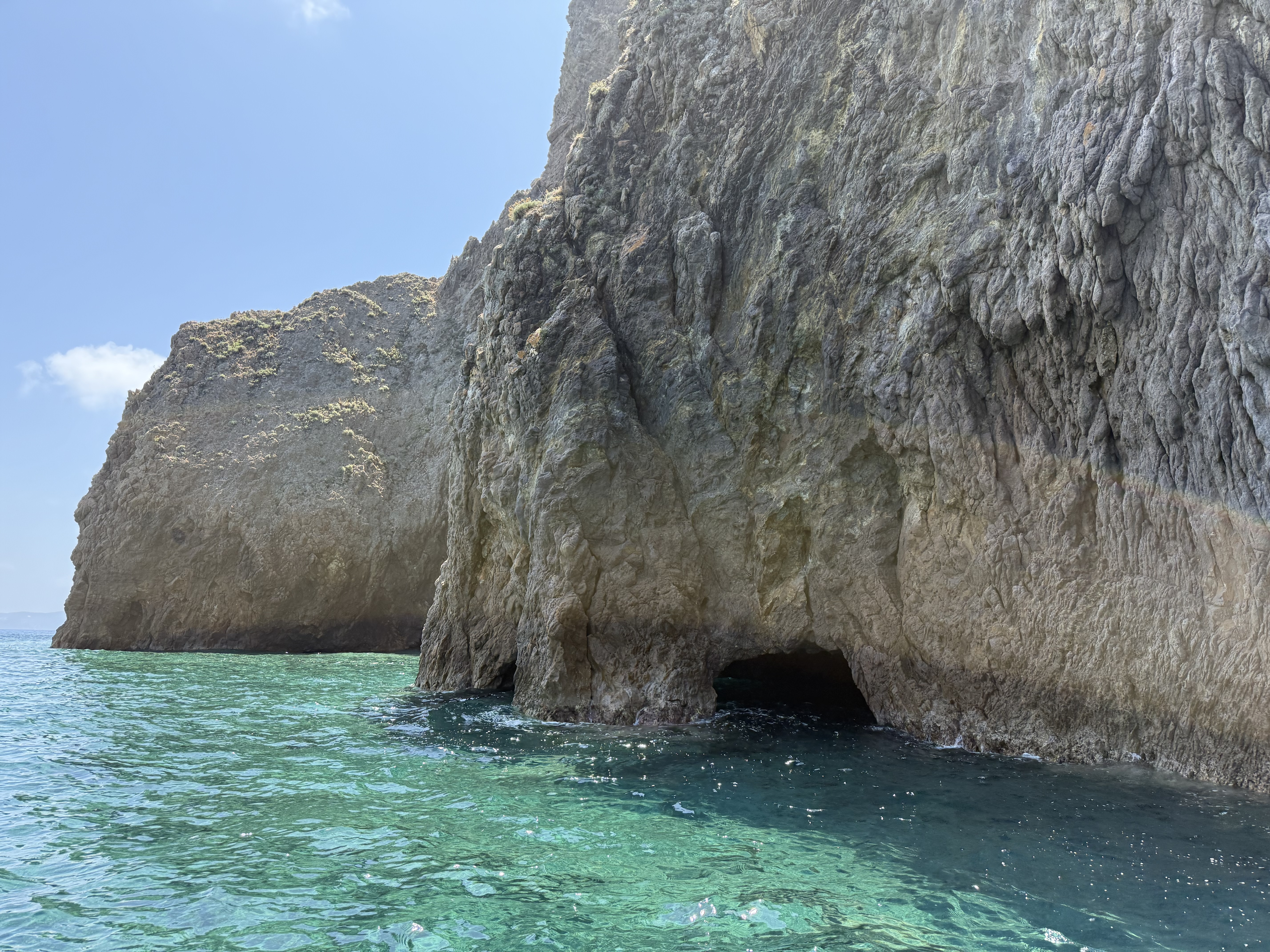 Ponza and Palmarola are busy with boats on the water and people on land. The summer holidays are kicking in and most of the voices we hear are English. Italy has a couple more weeks until the start of August when things really get crazy. For boaters it is possible to come from the Italian coastline very easily and ferries come continually from the mainland. Lots of beaches to choose from and a village filled with cafès and restaurants. Palmarola is a little more removed – you need a boat to get here or come by ferry boat for the day. But the weather is great and letting us anchor in along the incredible edge. Limestone cliffs so this means the water is a clear acqua green. And quite shallow – only 4 meters which is easy.